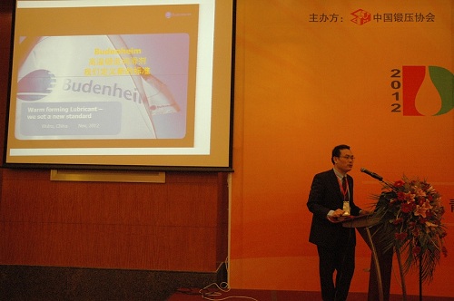 中国锻压网消息 (记者焦翠兰 北京报道)由中国锻压协会主办的“2012锻造模具及润滑会议”已于11月26-29日在安徽芜湖成功举办,会议以“提升模具设计制造水平,增强企业竞争力”为主题。会议现场,博德精细化工(上海)有限公司发布题为《BUDENHEIM高温锻造润滑剂——我们定义新的标准》的报告。